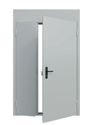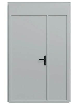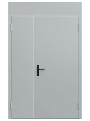 Конструкция с верхней неподвижной частью (фрамугой) позволяет сохранить стандартную, удобную высоту активной и пассивной створок, в то время как двупольное исполнение обеспечивает максимальную ширину для проноса крупногабаритных грузов или проезда техники. Это инженерно грамотное и надежное решение, обеспечивающее долговечность и простоту эксплуатации.