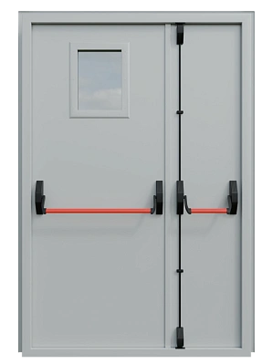 Двупольная техническая универсальная дверь с окном и системой «Антипаника» — это комплексное решение, разработанное для широких проемов на путях эвакуации, где необходим визуальный контроль. Модель объединяет безопасность экстренного выхода, удобство транспортировки габаритных грузов и преимущество естественного освещения, что делает ее идеальной для коридоров, холлов, производственных и общественных зданий.