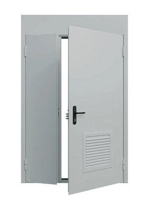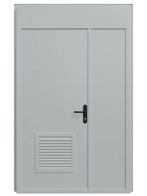 Двупольная техническая универсальная дверь с решеткой и фрамугой — это специализированное инженерное решение, предназначенное для нестандартных проемов большой высоты и ширины, где одновременно требуется обеспечить постоянную циркуляцию воздуха. Эта модель является оптимальным выбором для крупных котельных, насосных станций, производственных цехов и технических этажей с высокими потолками.