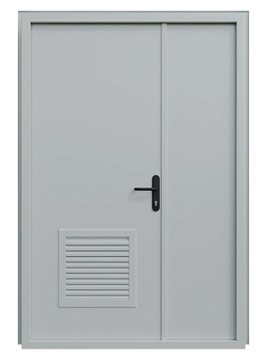 Конструкция с двумя створками обеспечивает максимальное удобство эксплуатации широкого проема, а встроенные жалюзийные решетки гарантируют непрерывную циркуляцию воздуха. Прочная стальная основа и продуманная конструкция делают эту дверь надежным и долговечным решением для служебных помещений с особыми требованиями к вентиляции.